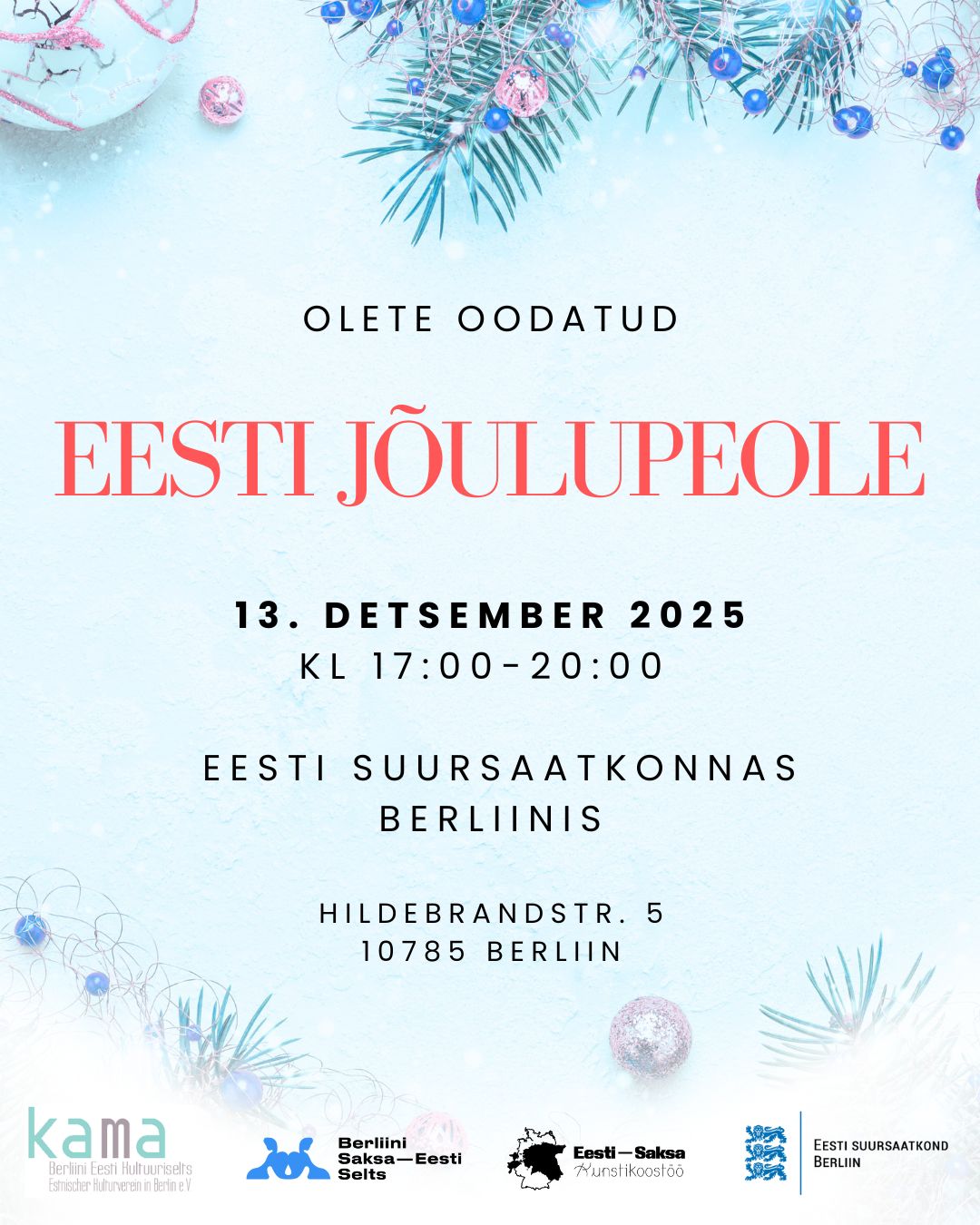 13. detsembril 2025 kl 17:00-20:00 toimub uue kuue saanud Eesti suursaatkonnas Berliinis (Hildebrandstr. 5, 10785 Berliin) kohaliku eestlaskonna ja Eesti sõprade ühine jõulupidu Eesti saatkonna, Deutsch-Estnische Gesellschafti ning kultuuriselts KAMA eestvedamisel.